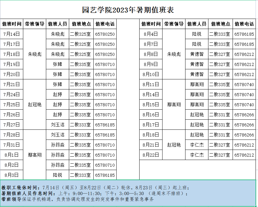 园艺学院2023年暑期值班表