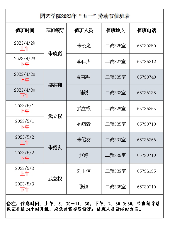 园艺学院2023年“五一”劳动节值班表