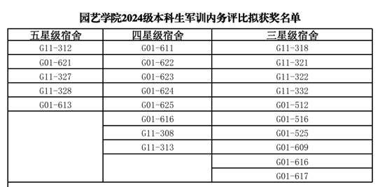 根据《园艺学院2024级本科生军训内务评比通知》,经过宿舍内务打分、学院评议,现将园艺学院2024级本科生军训内务评比结果公示如下: