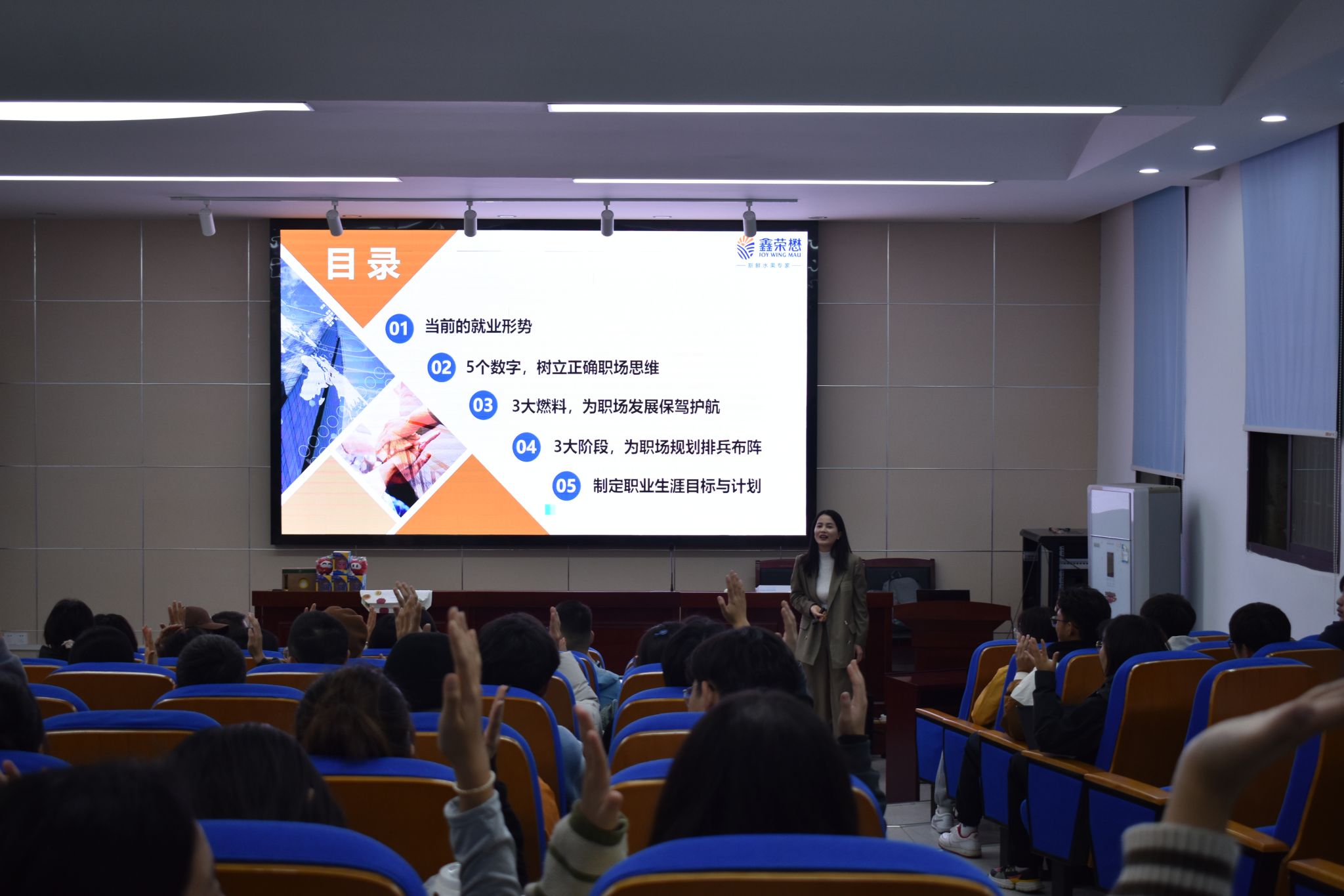 王兰清从经济状况、行业需求、个人能力、就业市场竞争等四个方面分析了当前就业形势。通过5个数字,帮助学生树立“多行动、少忧虑”的正确职场思维。介绍了“可迁移技能”、“有意义的经验”、“持久的关系”等3大燃料,在职场发展中保驾护航的作用。详细剖析了“认识自己,强势开局”、“聚焦长板,塑造商业价值”、“寻找机会,发挥持续影响力”等3大阶段,帮助学生为职场规划排兵布阵,制定可行的职业目标与计划。讲座现场气氛热烈,学生与讲座专家互动频繁。