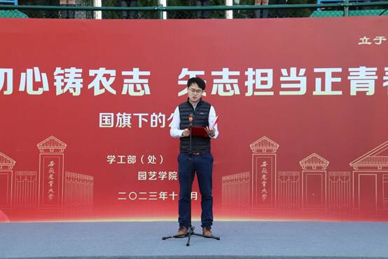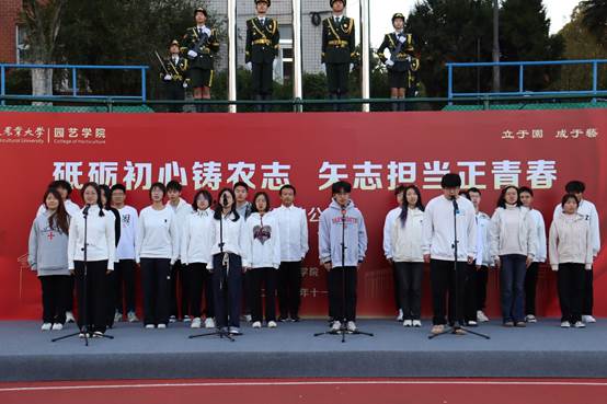 上午7时整,在全体师生的注目下,国旗护卫队脚踏正步,护送着国旗庄严入场。随着《义勇军进行曲》旋律响起,师生齐唱国歌,鲜艳的五星红旗冉冉升起。随后,本科生代表2021级设施专业孙学秋,在国旗前许下矢志奉献乡村振兴的青春誓言。园艺学院学生合唱团倾情演唱原创歌曲《奋斗的时代》,唱响青春最强音。教师代表李响教授给现场同学上了一堂微党课。回顾了他从一名青年学生成长为一个青年党员,到如今心怀国之大者,矢志从事农业科研报国的大学教授的成长历程,勉励同学们坚定信念、脚踏实地、勇于创新,做一个有理想、有担当、能实干的园艺人。