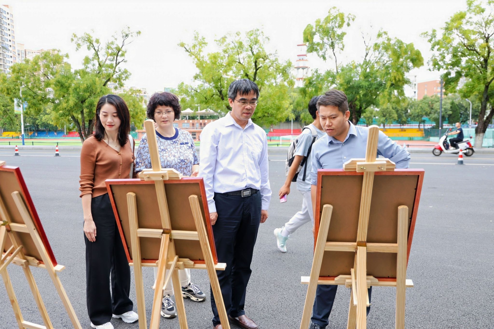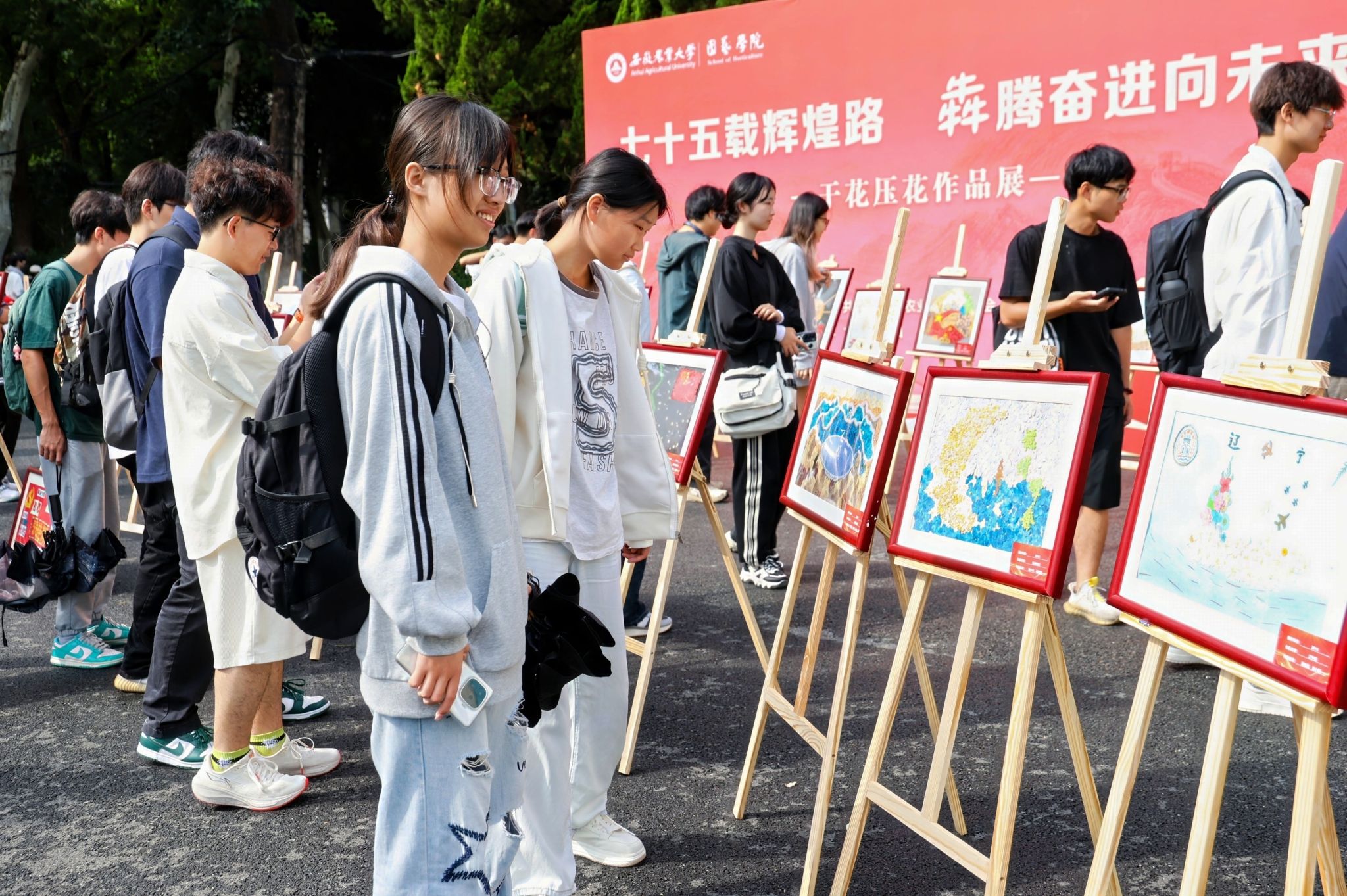 本网讯 9月27日上午,学院联合校团委在校大礼堂广场举办“七十五载辉煌路,‘犇’腾奋进向未来”干花压花作品展,献礼新中国75周年华诞。校党委常委、副校长蔡德军,党委宣传部、校团委、学院等单位负责人现场观展。作品展采取线下和线上图文直播的形式,单日线上浏览量达2.5万余次。
