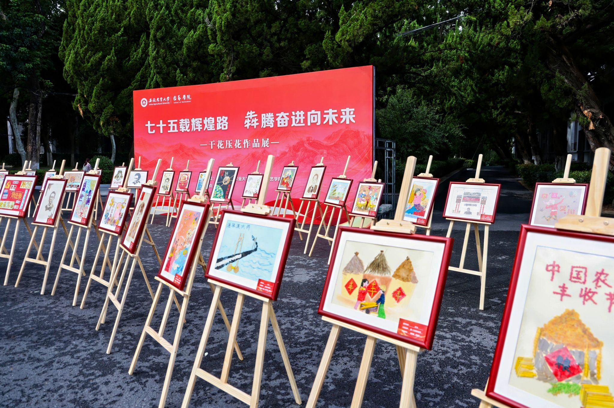 今年4月份以来,学院和校干花与压花艺术协会的150名师生,历时5个多月,最终制作出了75幅干花压花作品,献礼国庆。75幅压花作品,展示了新中国成立以来的光辉历程,既有开国大典、中美建交、南方谈话、加入WTO、建党百年、党的二十大等涵盖政治、军事、外交、经济的国家大事,还有土地革命、恢复高考、“大包干”、北斗卫星、北京奥运会等囊括教育、科技、“三农”的时事话题,融艺术性、文化性、历史性和思想性于一体,美育润心,一堂生动的思政课在一幅幅画作的流连品鉴间完成。