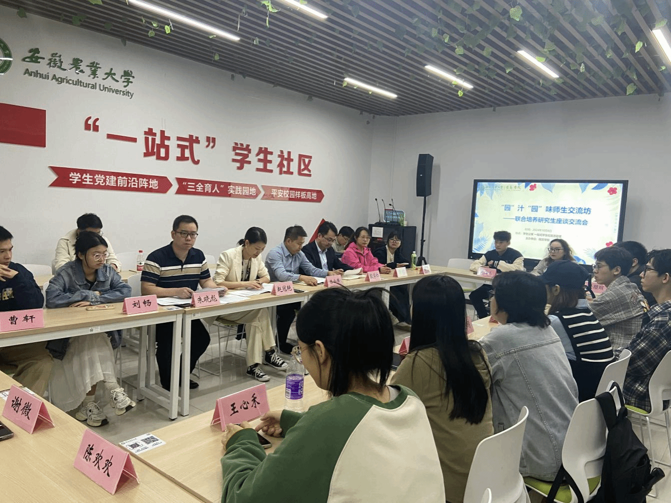 本网讯 10月8日晚,学院在一站式学生社区活动室举办第七期“园”汁“园”味师生交流坊暨联合培养研究生座谈会。会议邀请中国农科院蔬菜花卉研究所博士后、2018级学院联培生戴昀作经验分享。学院班子全体成员、辅导员,以及 2024级联合培养研究生参加会议。
