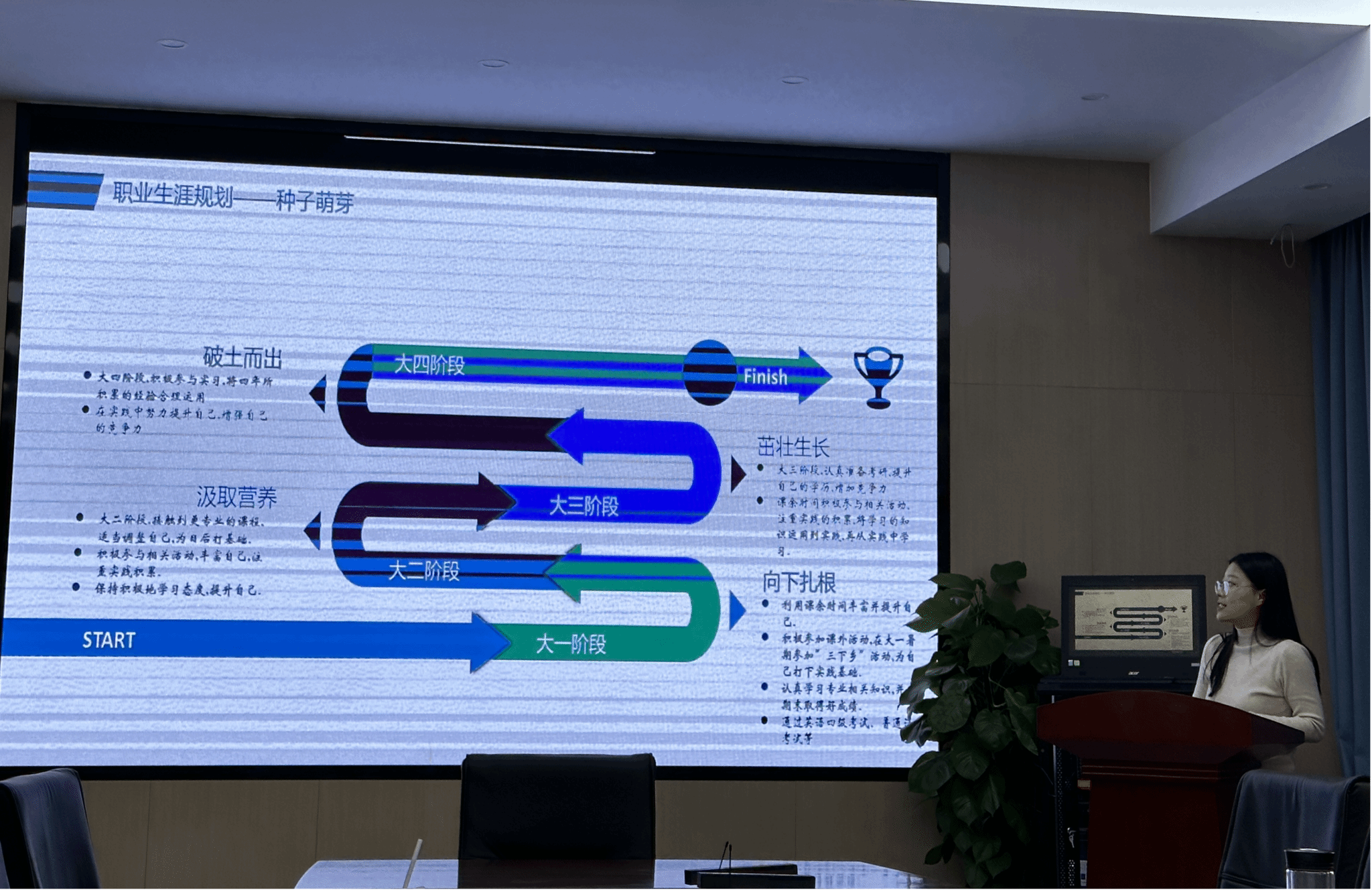 经过班级推荐、院办初步筛选,共12名同学进入学院复赛。成长赛道上,参赛选手从自我分析、职业定位、职业发展路径、评估调整等方面阐述生涯发展报告,就个人职业方向进行了深度解读就业赛道上,选手们深入分析行业动态和岗位需求,详细介绍了个人素质和专业能力与就业市场需求的适配度。评委老师进行现场打分测评的同时,针对真实工作场景中可能遇到的问题提出良好的意见和建议,帮助学生完善求职准备。