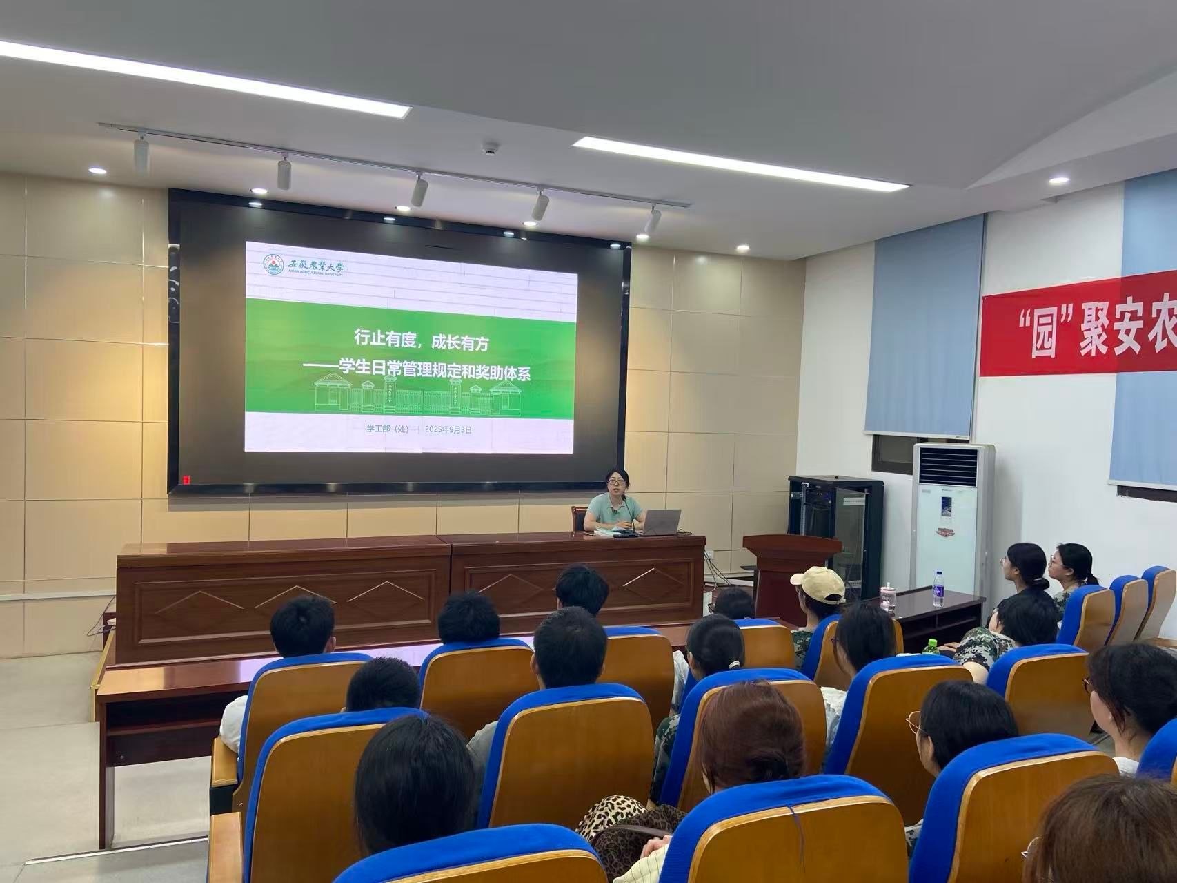 9月3日晚,安徽农业大学2025级本科生“‘芯’启航”入学教育——学生日常管理规定及资助体系教育管理课程在学院第二教学楼江淮园艺报告厅开讲。本次授课以园艺学院为主课堂,2025级全体新生通过分课堂线上直播形式同步参与。本次课程由学生处(学生资管中心)学生资助管理科科长陈玲玲老师主讲,园艺学院党委副书记、纪委书记叶辉主持。