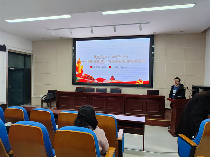 宣讲开始,范梦宇为大家作“中国式现代化的深刻背景和光明前景”主题宣讲。他提问:“作为农业类高校的青年大学生,大家是否想过我们能为中国现代化建设做出什么贡献?”引发了同学们的思考。他讲到:“青年的理想信念关乎国家未来。新时代青年应该脚踏实地,自觉把小我融入祖国的大我之中,融入推进中国式现代化的火热实践,在报效祖国、服务人民中书写青春华章!”