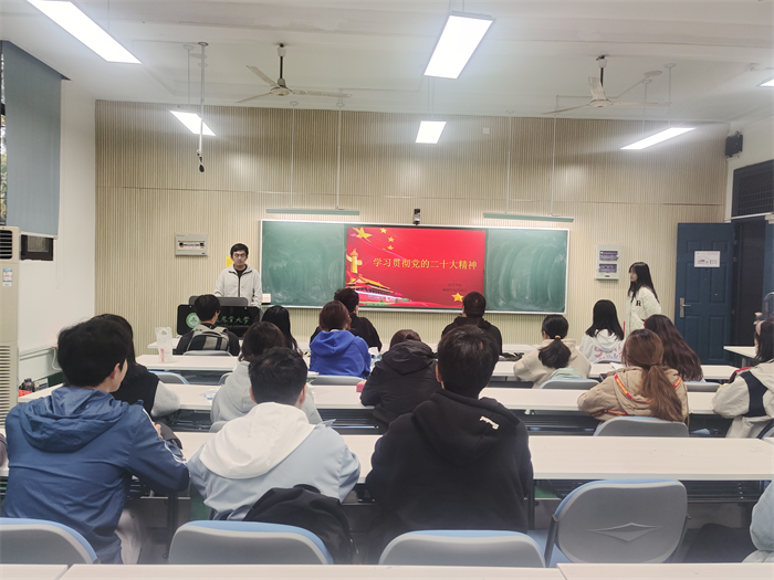 首先,由学生会办公室部长张昊领学党的二十大精神,他从二十大报告的主题、组成部分、重点内容等方面带领大家对三万多字的报告进行了简要学习,并引导大家会后要加强自学,真正理解什么是中国式现代化,真正懂得青年一代肩上的重任和使命。