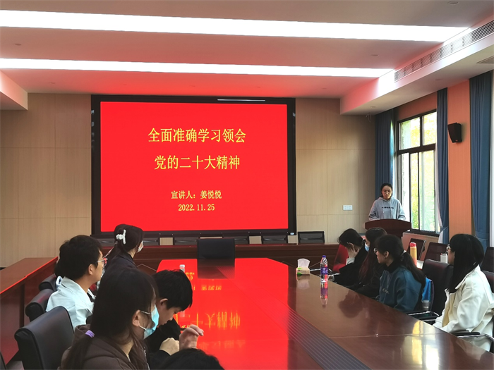 本网讯 11月25日中午,园艺学院团委在二教326召开全面准确学习领会党的二十大精神主题宣讲。学院团委、学生会等参加了学习,由团委兼职副书记姜悦悦进行宣讲。