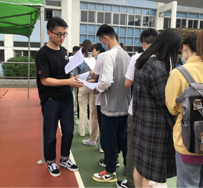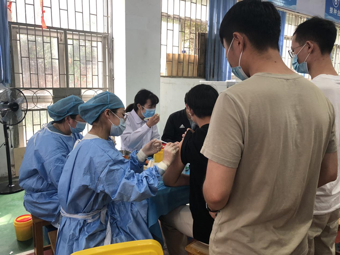 师生们接种疫苗时,志愿者们根据人流情况引导师生进行疫苗接种,为同学们拿包拿衣服,交代他们一些注意事项,并将注射完疫苗的同学和老师们引入观察区休息。