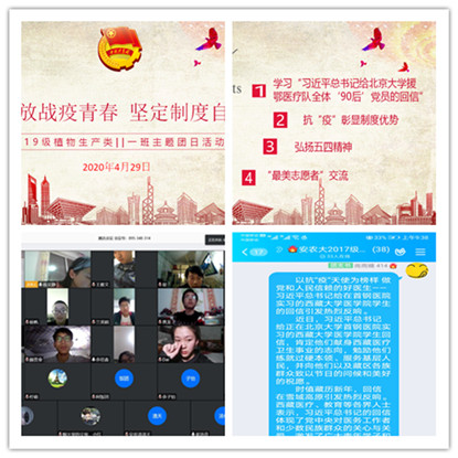 为深入学习广大90后、00后青年在此次战“疫”中的突出贡献,2019级植物生产类Ⅱ四班团支部和2017级园艺四班团支部分别通过QQ群和腾讯课堂组织团员观看了广大逆行者驰援武汉的视频,同学们通过讨论、对比世界各国在这场对抗疫情大考中的不同做法,感受到了中国力量、中国速度和中国精神,体会中国特色社会主义制度优越性。2019级植物生产类Ⅱ一班团支部在辅导员刘民老师的带领下,重温习近平总书记给北京大学援鄂医疗队全体“90后”党员的回信精神,大家充分认识到我国社会主义制度能够集中力量办大事的政治优势。此外,2019级植物生产类Ⅱ二班、三班团支部还分别开展了“五四精神”学习研讨和“云分享战疫故事”等主题班会,由在抗疫工作中被评为“最美志愿者”的同学分享自己的战“疫”故事和工作感悟,引领大家共同感受抗击疫情的先进典型事迹,增强同学们爱国力行的使命和担当。