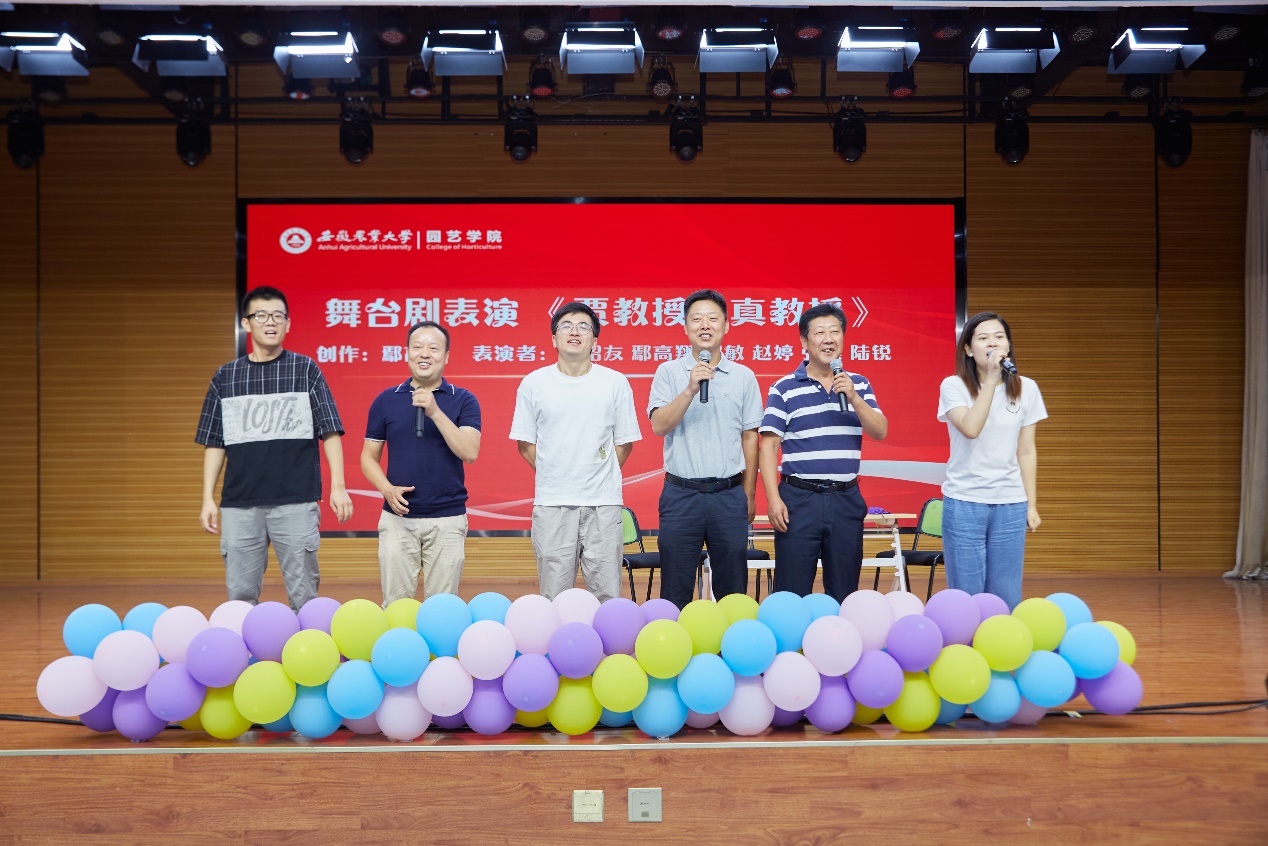 一台原创舞台剧《贾教授是真教授》,一部教师节主题视频《老师,您好》,将庆祝大会推向了高潮。一段故事、一个短片再现了园艺人服务乡村振兴的火热场面,重温了园艺人甘守三尺讲台的温情岁月。大会进行新进教师欢迎仪式,由荣休教师为他们佩戴校徽,新进教师代表李响分享了工作感想。